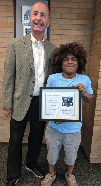 Principal Sorentino and the Kalkaska Public Schools Board of Education presented KHS Junior Diondre Blake with a certificate of recognition for "exemplary demonstration of courage, compassion, and character." We are so proud of our students who go above and beyond in showing Blazer Pride.